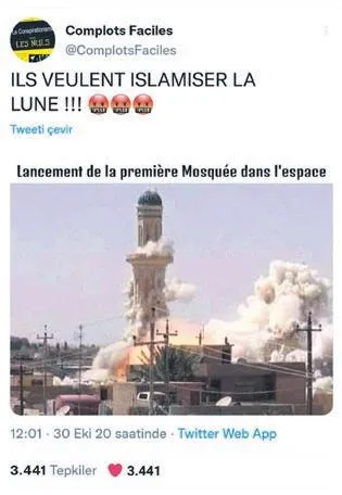 "Ay'ı İslamlaştırmak istiyorlar! Uzaya ilk cami fırlatılışı." Fransızların Complots Faciles adlı meşhur sosyal medya hesabına ait bu tweet.