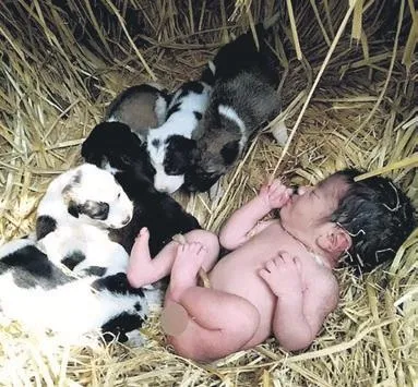 Köylüler, bebeği bir anne köpeğin fark ettiğini ve onu yuvasına taşıyarak yavru köpeklerle birlikte sıcak kalmasını sağladığını tahmin ediyor.