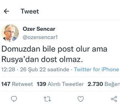 Sencar, Rusya'nın Ukrayna'yı işgalinin ardından "Domuzdan bile post olur ama Rusya'dan dost olmaz" diye tweet paylaştı.