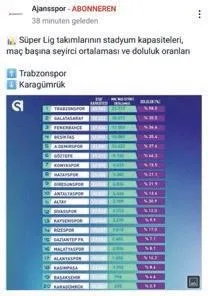 Ajansspor'un hazırladığı Süper Lig'deki stadyum kapasiteleri ve doluluk oranları listesinde, 37 yıllık şampiyonluk hasretine kavuşacak olan Trabzonspor'un bile maç başı seyirci ortalaması 23 bin 712.