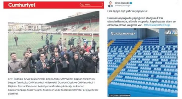 Örneğin CHP, altı yıl önce protesto edip yargıya başvuracağını söylediği Gaziosmanpaşa Stadı'nı AK Partili yönetim 2018'de başlayıp yüzde 90'ını tamamlamıştı.