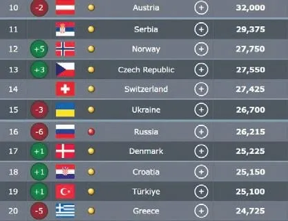 Türkiye'nin şu anda puanı 25.100. Bizim hemen üstümüzde yer alan 18. Hırvatistan'ın 25.150, 17. Danimarka'nın 25.225 puanı var.