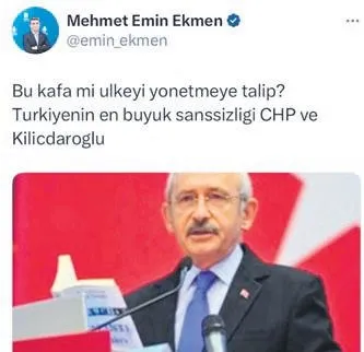Daha kötüsü Kılıçdaroğlu, "Ah Kılıçdaroğlu ah.. Yine mi çuvallamış?" ve "Türkiye'nin en büyük şanssızlığı CHP ve Kılıçdaroğlu" gibi paylaşımlar yapan Mehmet Emin Ekmen'i DEVA adayı olarak CHP listesinden Mersin'de aday gösterdi iyi mi?