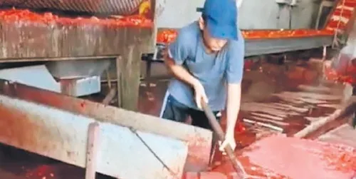 Görüntülerde kamyonda hiçbir hijyen önlemi alınmadan işçiler ayakkabılarıyla bastıkları domatesleri kürekle boşaltıyor.
