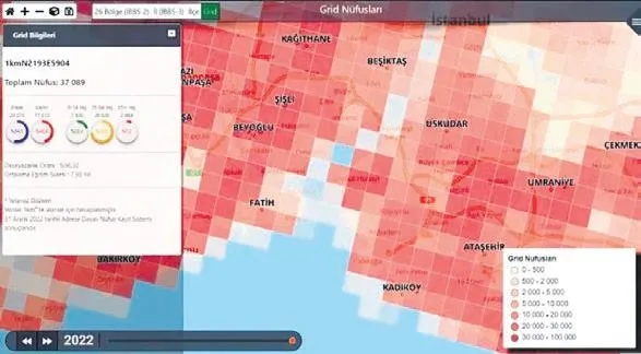 Türkiye İstatistik Kurumu (TÜİK), Türkiye haritası üzerinde 1 kilometrekarelik alanın nüfus bilgilerini gösteren 'Grid Nüfusları' adını verdiği haritayı kullanıma sundu.