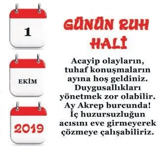 Öncelikle hayatımızda sorun olarak gördüğümüz alanlardan asla uzaklaşmıyor ve sorunlarımızı çözmek için kolları sıvıyoruz. Çünkü gökyüzünün pek de şakası yok. Hatırlıyorsanız 2019 yılının Haziran ve Temmuz ayları tutulmaların ve Merkür'ün geri hareketinin etkisiyle hepimizi sıkıştırmış ve başımıza olmayacak işler açmıştı. Ekim ayı böyle bir ay olmayacak, ancak sorunları görmezden gelenleri bir bir hayattan eleyecek. Daha büyük sorunlarla karşılaşmak istemiyorsanız hiçbir konu için 'Yarın hallederim' demeyin.