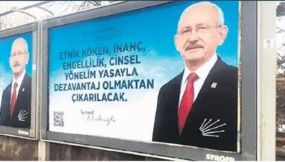 CHP lideri Kılıçdaroğlu, partinin vaadlerini ülkemizin çeşitli kentlerindeki ilan panolarından duyuruyor. Bu panolardan birisinde Kılıçdaroğlu'nun fotoğrafının yanında şöyle yazıyor: "Etnik köken, inanç, engellilik, cinsel yönelim yasayla dezavantaj olmaktan çıkarılacak."