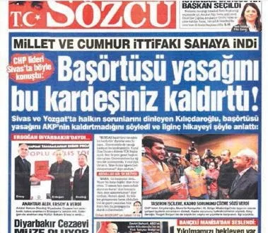 Sözcü, "Başörtüsü yasağını bu kardeşiniz kaldırttı" manşetiyle Kılıçdaroğlu'nu parlatırken, Karar ise "Kilidi kıran büyük uzlaşma" diyerek mübalağa sanatında yeni çığırlar açmış. Manşet altı fotoğrafta ise Abdullah Gül'ü elbette unutmamış. Düşünsenize, sene 2010, Erdoğan Başbakan ama başörtüsü yasağının çözülmesinde hiç etkisi yokmuş.