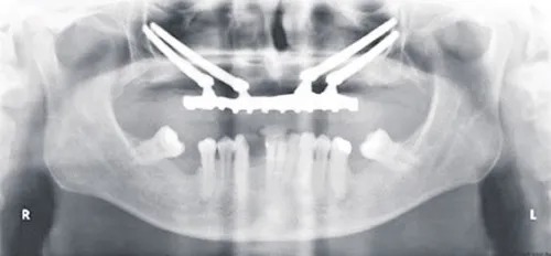 Yukarıda röntgeni görülen hasta, üst çene arka bölgede yeterli kemik olmaması nedeniyle kemik greftleri ve sinus yükseltme operasyonları için adaydır fakat zigoma implantlarının kullanımı sayesinde bu cerrahi prosedürlere gerek kalmamıştır. Zigomatik implant cerrahisi en iyi, derin sedasyon veya genel anestezi altında gerçekleştirilir.