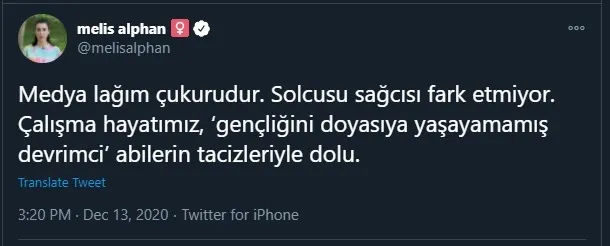 "Medya lağım çukurudur. Solcusu sağcısı fark etmiyor. Çalışma hayatımız, gençliğini doyasıya yaşayamamış devrimci abilerin tacizleriyle dolu."