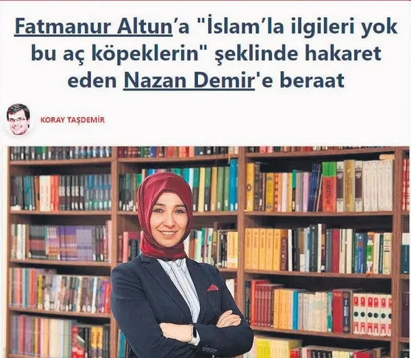 Cumhurbaşkanlığı İletişim Başkanı Fahrettin Altun'un eşi Fatmanur Altun, kendisine "İslam'la ilgileri yok bu aç köpeklerin" diye hakaret eden birisi hakkında şikâyette bulunmuş.