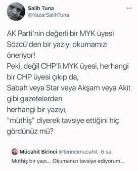 Sabah gazetesi yazarı Salih Tuna dün Twitter'da, AK Partili Mücahit Birinci'nin Sözcü gazetesinden bir yazıyı "Müthiş...