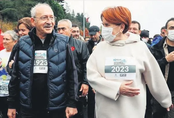 43. İstanbul Maratonu'nda koşan kitlelerin önünden yürüyen Millet İttifakı'nın ağır topları seçtikleri göğüs numaralarıyla mesajlar vermişler.
