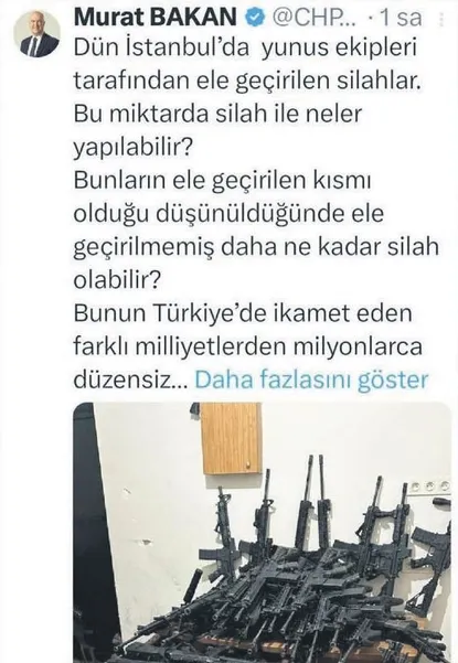 "Dün İstanbul'da yunus ekipleri tarafından ele geçirilen silahlar. Bu miktarda silah ile neler yapılabilir? Bunların ele geçirilen kısmı olduğu düşünüldüğünde ele geçirilmemiş daha ne kadar silah olabilir? Hele ki Türkiye'de ikamet eden milyonlarca göçmen olduğu düşünülürse... Türkiye uyuşturucu ticaretinde olduğu gibi silah ticaretinde de silah rotası haline mi geldi? Silahların meşei nedir? Yarın İçişleri Bakanı Ali Yerlikaya'dan açıklama bekliyoruz?"
