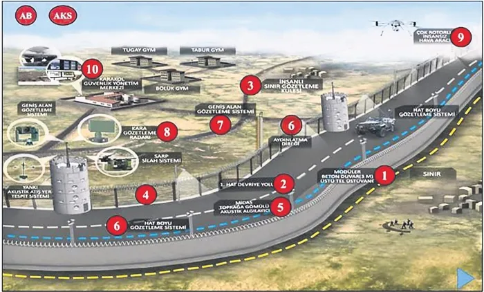 ÇOK KATMANLI: Hudutlarımız Cumhuriyet tarihinin en yoğun tedbirleriyle korunuyor. Hudut emniyeti konusunda, hiçbir ülkede böyle bir sınır sisteminin olduğuna inanmıyorum. Hududa götürdüğümüz kişi "Ben böyle bir şey görmedim" deyip diğer gün yazıyor. Sınır hattında çok katmanlı bir sistemimiz var. Modüler beton duvarlar, yüksek güvenlikli tel çitler, 4 metre derinliğinde 4 metre genişliğinde hendekler. Hendekler çok önemli. İran sınırında planlanan 376 kilometre hendeğin 341 kilometresini bitirdik. Bu sene tamamını bitireceğiz. Bu hendeklerden geçilmesi çok zor. Suriye sınırındaki duvarlarımızın yüksekliği 3 metreydi. İran sınırında yeni yaptığımız duvarların yüksekliğini 4 metre. Bunun üzerinde de 1.5 metre tel çit var. Buradan belki 1 kişi 2 kişi falan geçebilir. Ancak duvarı geçseler bile onun arkasında komando keşif unsurları var. Daha arkada jandarmanın pusuları var, onun arkasında polisin pusuları var. Hudut güvenlik sistemimiz dünyadaki örnekleri arasında en iyilerden biri.