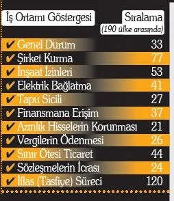 Türkiye, Dünya Bankası tarafından periyodik olarak yayınlanan İş Yapma Kolaylığı Endeksi'nde bu yıl 10 basamak birden yükselerek 190 ülke arasında 33. sıraya çıktı. Türkiye, iş ortamına dair bu ilerlemesiyle birlikte İsrail, İsviçre, Hollanda ve İtalya gibi ülkeleri geride bıraktı. Türkiye, geçtiğimiz yıl da bu endekste 17 basamak birden tırmanmıştı. İki yılda yakaladığımız sıçrama gerçekten kayda değer bir başarı. Türkiye, son yıllarda iş ortamını en hızlı iyileştiren ilk 10 ülkeden biri konumunda. İş Yapma Kolaylığı Endeksi, özellikle çokuluslu şirketlerin doğrudan yabancı yatırım yapma kararlarına etki eden birkaç kritik göstergeden biri. Yerli ve yabancı şirketlere düzgün bir iş ortamı sunarak piyasa dinamizmini yukarıya geçmek için bu endekste düzenli olarak ilk 20'nin içinde olmayı hedeflemeliyiz. Daha yukarılara tırmanmak için özellikle zayıf olduğumuz şirket kurma ve iflas süreci işlemlerine yönelik iyileştirici ve kolaylaştırıcı reformlara odaklanmamız gerekiyor.