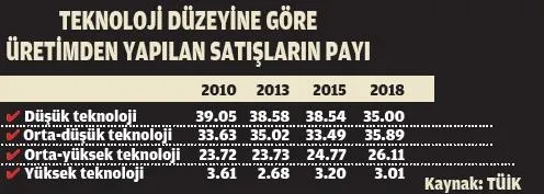 Türkiye'de sanayi ürün verilerine baktığımızda 2010'dan 2018'e geçen süre zarfında orta-yüksek teknolojili ürün grubunun payının kademeli olarak artarak yüzde 23,7'den yüzde 26,1'e yükseldiğini görüyoruz. Yüksek teknolojili ürün grubunun payı ise aynı dönemde yüzde 3,6'dan yüzde 3'e gerilemiş. Yüksek teknolojili sanayi ürünleri, 2019'un ilk 10 ayında yüksek en hızlı büyüyen üretim grubu olmuştu. Dolayısıyla 2019 verileri tamamlanıp TÜİK tarafından açıklandığında büyük ihtimalle yüksek teknolojili ürünlerin payının yüzde 3,5'e yaklaştığını göreceğiz.