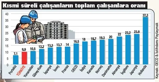 Türkiye'de kısmı süreli çalışanların oranı, OECD ülkelerinin altında yer alıyor. Gelişmiş ülkelerdeki kısmı süreli işlerin yaygınlığını Türkiye seviyesine indirdiğinizde bu ülkelerdeki yüzde 3-4 olan işsizlik oranlarının bir anda yüzde 9'a yükselme riski beliriyor. Özellikle gençler ve kadınlar arasındaki yüksek işsizliği azaltmak için kısmı süreli işlerin sayısını arttırmak bir hayli etkili olabilir.