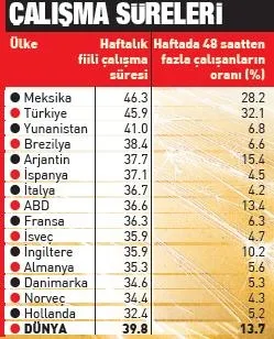 Türkiye'de haftalık fiili çalışma süresi ve fazla mesai yapan çalışanların oranı dünya ortalamasının oldukça üzerinde. OECD ülkelerinde 5 kişinin yaptığı işleri bizde ortalamada 3 kişi yapıyor. Türkiye'de istihdamın sosyal güvenlik ve yasal maliyetlerinin görece yüksek olması ve şirketlerimizin kalite odaklı bir anlayıştan ziyade maliyet odaklı bir stratejiyle karlılıklarını arttırmaya çalışmaları, düşük istihdamın ana nedenlerinin başında yer alıyor. Çalışanlar ağır iş yükünün altında ezildikleri için bir taraftan çalışma verimlilikleri düşerken bir taraftan da kendilerine ve ailelerine yeterli zamanı ayıramıyorlar.