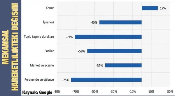 Google, virüsten ötürü insanların farklı mekanlara gerçekleştirdikleri ziyaretlerin sayısı ve buralarda geçirdikleri sürelerdeki değişime yönelik ülke bazında raporlar açıkladı. Raporlar, Google Harita uygulaması üzerinden alınan anonimleştirilmiş veriler kullanılarak oluşturulmuş. Türkiye'de 29 Mart gününde referans dönem rakamlarına (3 Ocak – 6 Şubat dönemini kapsayan medyan değer) kıyasla, konutlardaki hareketlilik yüzde 17 artarken, iş yerlerindeki hareketlilik yüzde 45 azalmış.