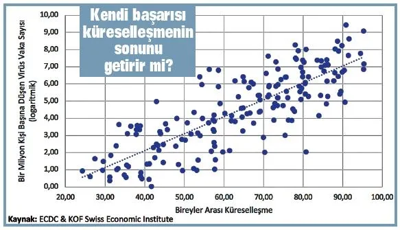 Küreselleşmenin en büyük başarılarından birisi dünyanın farklı köşelerindeki milyarlarca insanı birbirine bağlamasıdır. Ancak, küreselleşmenin bu başarısı koronavirüsün dünyayı tehdit eden bir salgına dönüşmesine neden oldu. Grafikten görüleceği üzere, bireylerin turist, öğrenci veya iş insanı olarak küreselleşmeye daha sıkı entegre oldukları ülkelerde koronavirüs vakaları daha fazla yaygınlaşıyor. Sürpriz bir sonuç değil. Ama küreselleşmeye yönelik belli kırılmalara neden olabilecek bir sonuç. Küreselleşme, 2008'deki krizden sonra uluslararası ticaret ve finans kanallarından ciddi yara almıştı. Ülkelerin kendi sektörlerini ve sermayelerini korumaya yönelik politikaları artmıştı. Küreselleşmenin ekonomik bacağının ciddi yaralar aldığı son on yılda küreselleşmenin sosyal bacağı daha fazla ön plana çıkmıştı. Uluslararası fuar, organizasyon ve kongrelerin yanı sıra uluslararası öğrenci programları ve yurtdışı tatiller sosyal küreselleşmenin yükselişini hızlandırdı. Virüsün neden olduğu psikolojik ve sosyolojik travma, küreselleşmenin sosyal bacağının da sekmesine neden olabilir. Örneğin, Dünya Turizm Örgütü virüs salgınının turizm sektörüne olumsuz etkilerinin 5 ila 7 yıla kadar sürebileceğini öngörüyor. Bu durum Türkiye gibi turizmin ekonomik pastadaki payının yüksek olduğu ülkeler açısından yüksek döviz kaybı demek. Küreselleşme tabi ki ortadan kalkmayacak. İletişim teknolojilerinin bu kadar gelişmiş olduğu bir çağda bu çok mümkün değil. Ancak ülkeler ve bireyler 'acaba gereğinden fazla mı küreselleşme dalgasına kapıldık?' sorusunu soracaklar. Küreselleşmenin bir süre gerileme tredine girmesi sürpriz olmayacak.