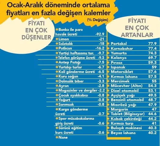 Fiyatı en fazla düşen harcama kalemlerinin başında ise banka ile para havale ücreti yer alıyor. Düzenlemelerdeki değişikliklerden dolayı bu kalemde ortalama ücret bedeli yüzde 92.9 düşmüş. Fiyatı en fazla gerileyenler listesinde limon, salatalık ve patlıcan gibi gıda ürünleri de var. Salgının etkisiyle yurtiçi ve yurtdışı gezi tur fiyatlarında gerileme yaşanmış. E-ticaret hızla yayılmasına rağmen, koli gönderme ücretleri yüzde 6.5, kargo gönderme ücretleri ise yüzde 0.7 aşağıya inmiş. Alternatif gönderi sistemlerin çıkmasıyla sektörde rekabetin artması ve e-ticareti özendirme girişimleri, fiyatların hafif de olsa gerilemesine neden olmuş olabilir.
