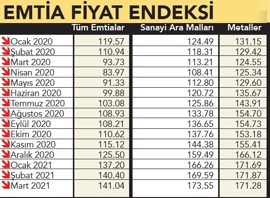 Tüketici ve üretici fiyatları nisanda da yükselişini sürdürdü. TCMB bu yüksek enflasyon ortamında faizi yüzde 19'da tutarak sıkı para politikasına devam mesajı verdi. Haziranla birlikte baz ve mevsim etkisinin devreye girmesi ve enflasyonun düşüşe geçmesi bekleniyor. TCMB'nin enflasyon ve çıktı açığı tahminlerine göre, talebin enflasyon üzerindeki yukarı yönlü etkisinin ağustos- eylül itibarıyla ortadan kalkacağı öngörülüyor. Artan maliyetlere bağlı olarak yüksek seyreden üretici fiyatları ise enflasyon üzerinde risk oluşturmaya devam edecek. ÜFE yıllık bazda 11 aydır aralıksız artıyor. Mayıs 2020'de yüzde 5.53 olan üretici enflasyonu Nisan 2021'de yüzde 35.17'yi gördü. ÜFE'deki artış oranı TÜFE'dekinden iki kat daha fazla. Döviz kuru geçişkenlik etkisinin yanı sıra küresel emtia fiyatlarındaki yüksek seviyeler, üretici fiyatlarını körüklüyor. Salgının tetiklediği olağanüstü arz ve talep koşulları, küresel emtia fiyatlarının rekor üstüne rekor kırmasına neden oluyor. IMF'in emtia fiyat endeksi Ocak 2020'den bu yana yüzde 18 oranında arttı. Metallerdeki artış oranı yüzde 30 iken, sanayi ara mallarındaki artış oranı ise yüzde 40'a yaklaştı.