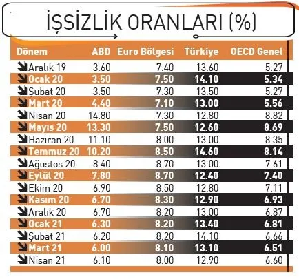 Mali destekler ve aşılanmayla birlikte ekonomik aktivitenin normalleşmeye başlaması istihdam artışını beraberinde getirdi. Ancak, işsizlik halen salgın öncesi seviyelerin üzerinde. Mayıs 2021 itibariyle OECD ülkelerindeki ortalama işsizlik oranı yüzde 6.6. İstihdamda oluşan kayıpların bu yıl tamamen telafi edilebilmesi çoğu OECD ülkesi için mümkün gözükmüyor. OECD'nin projeksiyonuna göre, ABD ve Birleşik Krallık'ta istihdamın salgın öncesi seviyelere dönmesi 2023'ün sonunu bulabilir. Almanya, Japonya ve Avusturalya gibi bazı ülkelerde ise 2021 içerisinde rakamlar eski seviyelerine dönebilir.
