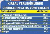 Tarım ve hayvancılıktan elde edilen kârın düşük olması da kırsal ekonominin gelişimini baskılıyor. Kırsalda yetişen ürünü kullanıcıya ulaştırma noktasında aracılara bağımlılık yüksek olunca, üreticilerin eline az para geçiyor. Raporun bulgularına göre, toptancı/tüccar/aracı üzerinden yapılan satışlar yüzde 37.4'lük pay ile ürünlerin satış yöntemleri sıralamasında ilk sırada.