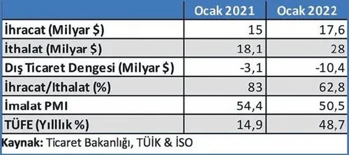 Veri akışının yoğun olduğu bir haftaydı. İhracat ocak ayında yüzde 17.3 gibi etkileyici oranda bir artış kaydetse de dış ticaret açığının çift haneyi (10.4 milyar dolar) görmesine engel olamadı. Açık, tüketim mallarından kaynaklı olarak artmadı. Hatta kur etkisinden dolayı tüketim malları ithalatında 2021'e kıyasla yüzde 1.7'lik azalış var. 9 milyar doları bulan aylık enerji ithalatı, dış ticaret açığını arttıran ana faktör. Petrol ve doğalgaz fiyatlarındaki küresel tırmanış Türkiye gibi enerjide dışa bağımlı ülkelerin ithalat faturasını kabartıyor. Enerjiyi dışarıda tutsak da ihracatın ithalatı karşılama oranında 5.6 puanlık düşüş var. Üretim kapasitelerini artıran veya hammadde stoku yapan firmaların ithalat talepleri, bu farkı oluşturmuşa benziyor. Sadece bir aylık veriye bakarak büyük çıkarımlar yapmamak ve karamsarlığa kapılmamak lazım. Yapılması gereken şey, yıla dair riskleri ve avantajları iyi tahlil edip, stratejileri ve politikaları buna göre belirlemek olmalı.