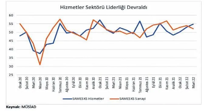 Salgın öncesinde 'erken sanayisizleşme' sorunundan muzdarip Türkiye için sanayinin yeniden yükselişi yüzleri güldürdü. Salgının etkisinin iyice hafiflemesi ve kısıtlamaların oldukça gevşetilmesi hizmetler sektörünün önünü açtı. İnsanlar eski rutinlerine geri dönüyor. Bu da hizmetler sektörünün canlanmasını sağlıyor. MÜSİAD'ın açıkladığı Satınalma Müdürleri Endeksi (SAMEKS) verisi gibi öncü göstergeler, hizmetler sektörünün kayıplarını telafi etmeye başladığını ve hatta iktisadi aktivitenin seyri açısından sanayiyi geçtiğini gösteriyor.