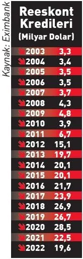 İhracatçılar yaklaşık bir yıldır reeskont kredisi programının düzgün işlemediğinden şikâyet ediyorlardı. Rahatsızlık yaratan ana konular; kredi limitlerinin düşük kaldığı, bürokratik sürçlerinin ise uzadığı yönündeydi. Son birkaç haftadır bu şikayetlere yükselen kredi maliyetleri de eklenmişti. 2020'de 28.5 milyar dolar olan reeskont kredilerinin toplam miktarı geçen yıl 19.4 milyara indi. Reeskont kredilerinin toplam ihracata oranı yüzde 17'den yüzde 7.7'ye geriledi. İhracat; üretimden taşımacılığa, tasarımdan pazarlamaya kadar tüm süreçleri maliyetli bir faaliyet. Krediler sıkışınca da reel sektörün yeni ihracat fırsatlarını kullanma şansı azalabiliyor.
