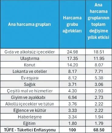 Yıllık bazda enflasyonu tetikleyen bir numaralı unsur, gıda ve alkolsüz içeceklerdeki fiyat artışları. Yüzde 68.5 olan tüketici enflasyonunun 18.5 puanı mutfağı ilgilendiren yiyecek ve içeceklerden geliyor. Enflasyonun en fazla etkileyen ikinci harcama grubu ise ulaştırma. Konut grubu üçüncü, lokanta ve otellerdeki fiyat artışları ise dördüncü sırada.