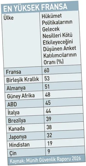 Batılı ülkeler artık kendi insanlarına bile umut veremiyor. Raporda paylaşılan verilere göre, Fransa'da insanların yüzde 60'ı hükümet politikalarının gelecek nesilleri kötü etkileyeceğini düşünüyor. Geleceğe bu açıdan kötümser bakanların oranı Birleşik Krallık'ta yüzde 53, Almanya'da yüzde 51 ve ABD'de yüzde 45. Çin ve Hindistan gibi gelişen ülkelerde ise tablo tam tersi. Çin'de insanların yüzde 80'i hükümet politikalarının gelecek nesilleri olumlu etkileyeceğini düşünüyor. Yine raporun bulgularına göre, Fransa ve İtalya gibi Avrupa ülkelerinde insanların yüzde 73'ü kendini "çaresiz" hissediyor.