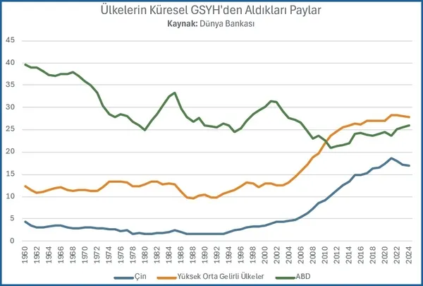 ABD yeni düzeni tek başına inşa edecek askeri ve ekonomik güçte değil. ABD son 50 yılda hangi savaştan tam anlamıyla zaferle ayrıldı? Vietnam da mı? Afganistan da mı? Peki ya Irak? Ekonomi tarafı da o kadar parlak değil. ABD'nin küresel sanayi üretiminden aldığı pay son 50 yılda yüzde 28'den yüzde 15'e geriledi. ABD'nin küresel GSYH'deki payı 1960'ta yaklaşık yüzde 40'tı. Bugün bu oran yüzde 25'e indi. Çin ise bu göstergelerde sürekli yükselişte. Dünyada üretilen her sanayi ürününün neredeyse üçte biri Çin'de üretiliyor. Çin, küresel GSYH'den aldığı payı yüzde 3-4'ten yüzde 17'ye çıkardı. Aralarında Çin ve Türkiye'nin de olduğu yüksek orta gelirli ülkelerin küresel ekonomiden aldığı pay yüzde 12'den yüzde 28'e yükseldi.