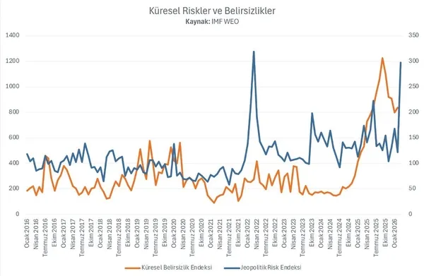 Grafikten de görüleceği üzere, son beş yılda riskler ve belirsizlikler oldukça yüksek seviyelere ulaştı. Dış şoklar sıklaştı. Bu şoklar yalnızca savaşlardan değil, aynı zamanda gümrük tarifeleri ve yaptırımlar gibi korumacı politikalardan da kaynaklanıyor. Bunun yanı sıra ekonomiler, yeşil dönüşüm ve yapay zekâ temelli dijital dönüşüm gibi meydan okumalarla karşı karşıyalar. Tüm bu şoklar ve dönüşümler, ekonomileri stres testine tabi tutuyor.