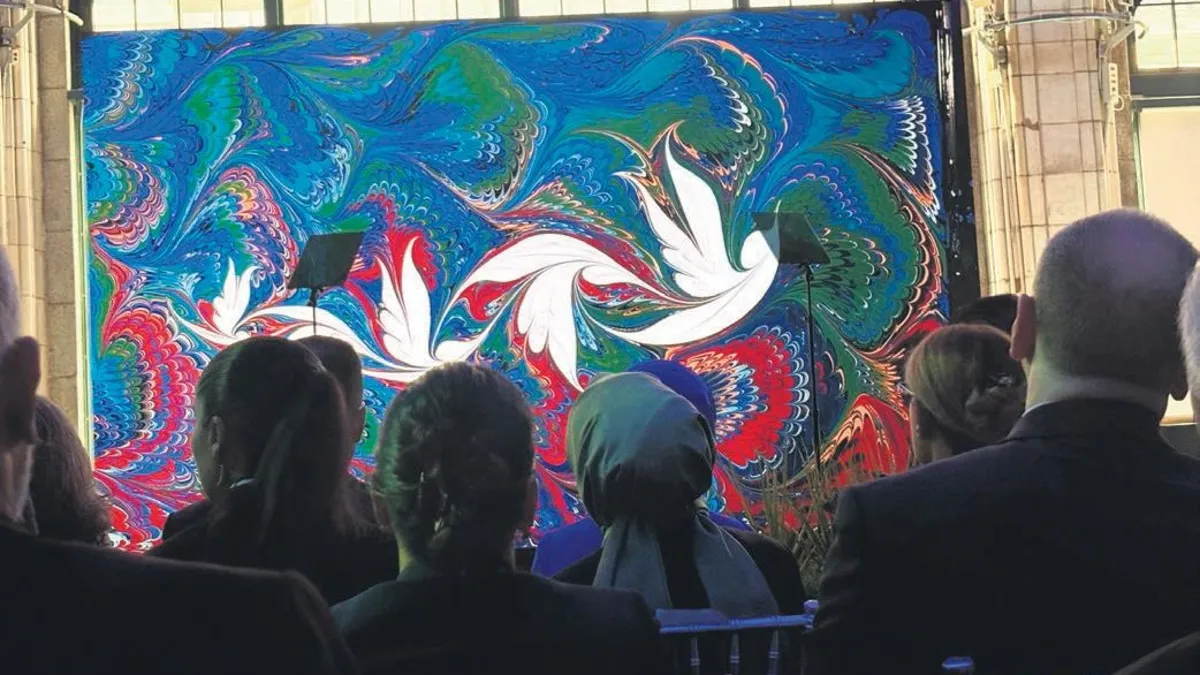 Suyun üzerine düşen renkler, Ali Saran'ın bestesiyle birleşince salon adeta bir sahneye dönüştü. Müzik eşliğinde suyun yüzeyinde şekillenen desenler hem büyüleyici bir görsel şovdu hem de bize "su olmadan sanat bile var olamaz" duygusunu hissettirdi. Garip Ay'ın ebru eseri ayrı bir yolculuktu. Geleneksel ebrunun akışkan renklerine gizlenmiş plastik parçaları gördüğümde içim burkuldu. O renklerin arasında beliren kaplumbağa figürü, bana suyun hem estetiğini hem de kırılganlığını aynı anda hissettirdi.