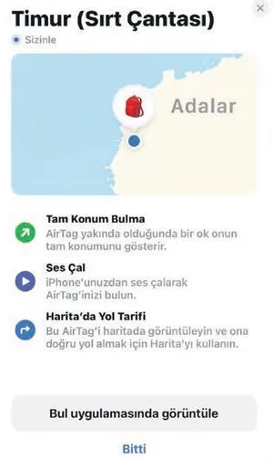 İlkokulda okurken her defterin üstüne bir etiket yapıştırdığımızı hatırlıyorum. Bu etiketlere isim soyad, hangi ders ve hangi dönem için kullandığımızı yazardık. Bavullarımıza koyduğunuz etiketlerin de akıllandığını ve kendini hatırlattığını düşünün. Apple AirTag akıllı bir etiket. Çanta, cüzdan, anahtarlıklara veya sizin için değerli bir eşyaya bağlanıyor. Minik yuvarlak bir rozet gibi taşınabiliyor. Hatta onun için tasarlanmış şık anahtarlık ya da çantalara takılmak üzere hazırlanmış renkli aksesuvarlar var. Siz telefonununuza bir kez tanımlamayı yaptıktan sonra diğer Apple ürünlerinde olduğu gibi Bul (Find My) uygulaması üzerinden kontrol edebiliyorsunuz. Üstelik nerede olduğunu bluetooth üzerinden telefonunuza gösterdiği gibi yönünü de tarif edebiliyor.