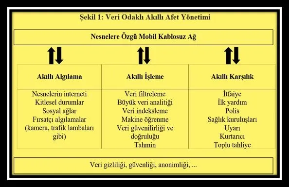 Veri kaynaklarından bir diğeri akıllı şehirler bağlamında kullanılan teknolojilerdir. Şehirlerin sorunlarının çözümü için geliştirilen ve kullanılan teknolojiler, afet yönetimi açısından da kritiktir. Özellikle deprem gibi afetlerin en çok etkilediği yerler olan kentsel alanlardan toplanan veriler afet yönetiminde oldukça kullanışlıdır. Dolayısıyla akıllı afet yönetimi açısından veri temelli bir sistematik yapı öngörülebilir. Bu sistematik Şekil 1'de yer almaktadır.[i]