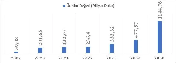 PwC ve IMF'în gelecek projeksiyonları üzerinden Türk sanayisine bakıldığında 2050'de 1.144 trilyon dolarlık üretim değerine ulaşacağı öngörülüyor. Bu projeksiyonlardan hareketle Türkiye'nin 2050'de en büyük yedinci sanayi ülkesi olup küresel sanayi üretiminden yüzde 2.41 pay alması beklenebilir. İstihdam edilen kişi başına 90 bin dolarlık üretim değerine işaret eden Türk sanayisinin yakalamış olduğu trend İtalya ve İspanya gibi aktörlerin geçilebileceğini gösteriyor (Grafik 1).