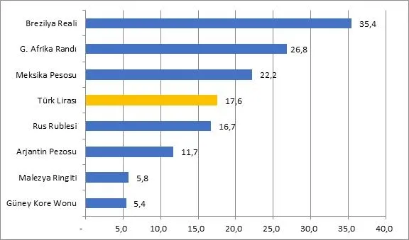 Sıfır mesabesine düşen risk iştahının doğal bir sonucu olarak dolar kuru da gelişmekte olan ülke para birimleri karşısında ciddi şekilde değer kazandı. Yılbaşından bu yana Brezilya reali dolar karşısında tam yüzde 35 değer yitirdi. Güney Afrika randı yüzde 27 düşerken Meksika pezosundaki gerileme yüzde 22 düzeyinde oldu. Türk Lirası da yüzde 18 civarında değer yitirdi. Bu süreçte en parlak performanslara sahip olan Güney Kore wonu ve Malezya ringiti ise dolar karşısında "sadece" yüzde 5-6 düzeyinde değer yitirdi.
