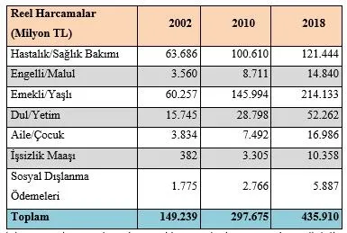 Gelelim sosyal harcamalara… Asgari ücrette yaşanan büyük dönüşümün bir benzerinin de sosyal koruma harcamalarında yaşandığını görüyoruz. Bu harcamaların toplam düzeyi 2002'de 33 milyar TL iken 2018 itibarıyla 436 milyar TL'ye yükseldi. Bu süreçte genel olarak fiyatlar da 4,55 katına çıktı. Bu durumu dikkate alarak hesap yaptığımızda 2002'deki 33 milyar TL'nin 2018'deki 149 milyar TL'ye eş değer olduğunu görüyoruz. Bu da sosyal koruma harcamalarının reel düzeyinin 2002-2018 döneminde neredeyse 3 katına çıktığı anlamına geliyor. Bu dönemde reel sağlık harcamaları neredeyse 2 katına çıkarken emekli ve yaşlılar için harcanan para reel olarak 3,6 katına yükseldi. Engelli ve maluller, dul ve yetimler ve fakir aileler için harcanan para miktarında çok ciddi artışlar yaşandı. İşsizlik maaşı ödemesi de 0,4 milyar TL'den 10,4 milyar TL'ye kadar yükseldi. Muhalefet ise sosyal politikada yaşanan bu devrimi uzun yıllar boyunca "makarna-kömür siyaseti" olarak damgalamaya çalıştı. Son yıllarda ise ya sessizliğe büründü ya da "Kimin parasıyla yapıyorlar" argümanına sarılmaya çalıştı.