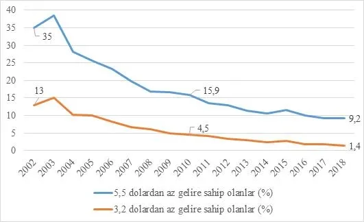 Hasılı hem asgari ücrette hem de sosyal harcamalarda yaşanan dramatik iyileşmeler Türkiye'de fakirliğin 2000'lerde ciddi şekilde gerilemesine neden oldu. Peki ne kadar? Dünya Bankası'nın 2011 satın alma gücü paritesine göre hesaplanmış iki fakirlik eşiği bulunuyor: 3,2 ve 5,5 dolar. Dünya Bankası verilerine göre Türkiye'de günde 5,5 dolardan daha az gelire sahip olanların oranı 2002'de yüzde 35'ti. Bu oran 2018 itibarıyla yüzde 9'a geriledi. Günde 3,2 dolardan daha az gelire sahip olanların oranı da 2002'de yüzde 13 idi. Bu oran 2018 itibarıyla yüzde 1,4'e kadar geriledi.