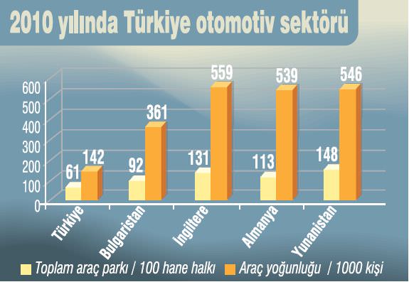 İngiltere ve Almanya'da hatta şu anda ekonomik krizle boğuşan komşu Yunanistan'da bile rakamlar Türkiye'nin çok üstünde. Bin kişiye düşen araç sayısı (Araç yoğunluğunu gösteriyor) İngiltere'de 559, Almanya'da 539, Yunanistan'da 546 adet. 100 haneye düşen araç sayısı (Toplam araç parkını gösteriyor) ise İngiltere'de 131, Almanya'da 113, Yunanistan'da 148.