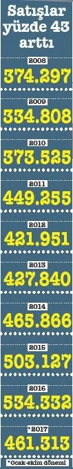 2017'nin ilk 10 ayında ise geçen yılın aynı dönemine göre yüzde 8,6 artışla 461 bin 313 adede yükseldi. Yıl sonunda toplam satışların 550 bin adet seviyesinde gerçekleşeceği öngörülüyor.