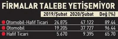 Otomotiv pazarında iki aylık artış ise yüzde 89.55 olarak gerçekleşti. Ocak-Şubat aylarında 74 bin 395 adet otomobil ve hafif ticari araç satıldı. 2019'un aynı döneminde 39 bin 248 adet araç satılmıştı. Otomobil satışlarındaki iki aylık artış yüzde 97 oldu. Şubat sonu itibarıyla 59 bin 743 adet otomobil satıldı. Hafif ticari araç satışları ise ocak-şubat döneminde yüzde 61.65 artışla 14 bin 562 adede yükseldi.