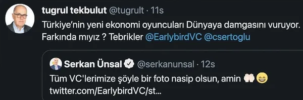 Avrupa'da gelişmekte olan pazarlardaki yatırımlarıyla dikkat çeken Earlybird Digital East Fund ortaklarından olan Cem Sertoğlu ve Mehmet Selçuk Atıcı Zynga'nın 1.6 milyar dolara satın aldığı Peak'in de en büyük yatırımcısıydı. New York'ta halka açılış töreni sonrasında UiPath kurucusu Daniel Dines ve şirketin ortaklarından EarlyBirds girişim sermayesi fonu kurucusu Cem Sertoğlu birlikte selfie çekti.