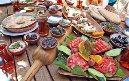 Girişteki tabelasında yazıyordu; "DOYMADAN KALKMAK YASAK" diye. Doymadan kalkmanın imkansız olduğunu ispatlarcasına yemyeşil kocaman bahçede oturduğumuz anda masamız bir anda donatıldı. Masada yok yoktu. Yeşil örtülerin üzerindeki mavi tabaklar ve ortadaki ahşap özel yapım kahvaltı servisleri inanılmaz bir görsel şölenin başlangıcı gibiydi. Masaya bir anda gelen rengarenk mis kokulu reçeller, peynir çeşitleri, taptaze yeşillikler, kurutulmuş domatesten yapılmış acuka, patlıcan köz, kendi ürettikleri zeytin çeşitleri, çeşit çeşit gözlemeler, pufidik pufidik pişiler ve en baştan çıkartıcı kısmı sıcacık bazlamalar. O sıcacık bazlamaların üstüne sürülen Trabzon'dan gelen tereyağı, Kayseri'den ev yapımı sucuk, karadut receli ve lor peyniri ... Hepsi nefis. Hele o masaya sonradan gelen domates ve biberin inanılmaz kokusuyla bütünleşmiş menemen. Mekanda masa tam bir festival alanına dönüşüyor. Ege'nin kahvaltısı böyle oluyor işte; rengarenk ve taptaze.
