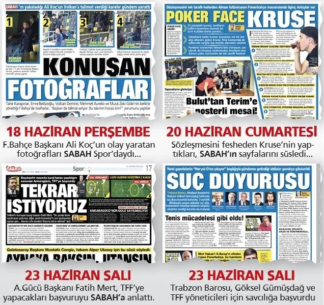 Koronavirüs yüzünden futbola ara verildiği günden itibaren bir yol haritası çizdik… Her spor dalında birinci haber öğemiz olan maçlar oynanmazken, oyunların aktörlerinin bu zorlu dönemde neler yaşadıklarını röportajlarla sayfalarımıza taşıdık. Türkiye, UEFA'nın alacağı kararları, EURO 2020, Şampiyonlar Ligi, Avrupa Ligi'nin geleceğini mart ayından itibaren SABAH Spor'dan öğrendi. Ligin yeniden başlamasıyla birlikte sadece yazı ve yorumla değil 'haberin ana öğesi olay fotoğraflar' ile de gündemi belirledik. Fenerbahçe Başkanı Sayın Ali Koç'un antrenör Volkan Demirel'i çağırıp verdiği talimatlar kare kare sadece bu sayfalarda yer aldı. Hem sosyal medyaya hem de internet sitelerine yine haber kaynağı olduk... A.Gücü'nün de sesi olduk G.Saray'ın da.. Bakın kaç gündür hakem kararları tartışılıyor. Tüm detaylarıyla bu yaşananları bu sayfalarda okuyorsunuz. Trabzonspor'un isyanı... TFF'deki yapı iddiaları... Alanya-Trabzonspor maçı sonrası yaşananlar… Yazarlarımız maç sonu analizleriyle saha dışında yaşanan her polemik ve Türk futbolunun sorunlarına dair görüşlerini keskin ve özgür kalemleriyle de dile getiriyorlar. Adaletli oyunun yanındayız. Maçlar sürüyor. Umarız ki daha az hatanın yapıldığı, vicdanlarda tartışma yaratmayacak kararlar olur. Bu süreçte en büyük görev de TFF ve onun kurulu MHK'ye düşüyor. Özellikle de MHK'ye!