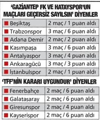 Gelin görün ki bir tartışma var 1 aydır… Hatayspor ve Gaziantep FK ile oynanan maçların sayılmaması gündem. Kulüpler Birliği Vakfı önceki gün toplanıp bu konuyu masaya yatırdı. Kurşun kalemle yazılan bir yazıyı bile silmek kolay değil. İyilikte yarışıp, omuz omuza verenler bu sefer diyor ki 'Benim puanlarımı verin.' Karşı karşıya geldiler! İsteyen de var istemeyen de. Fikir birliği yok zaten. Yandaki grafikte bilgiler mevcut. Hatayspor da katılmış toplantıya. Onların önünde bu tartışmalar yaşanmış. Oradaki kişilere normal gelmiş olabilir ama bana gelmedi. 12 kulüp var biri Hatayspor.